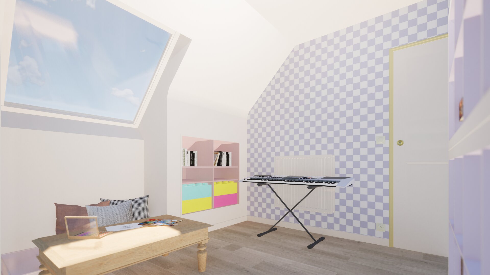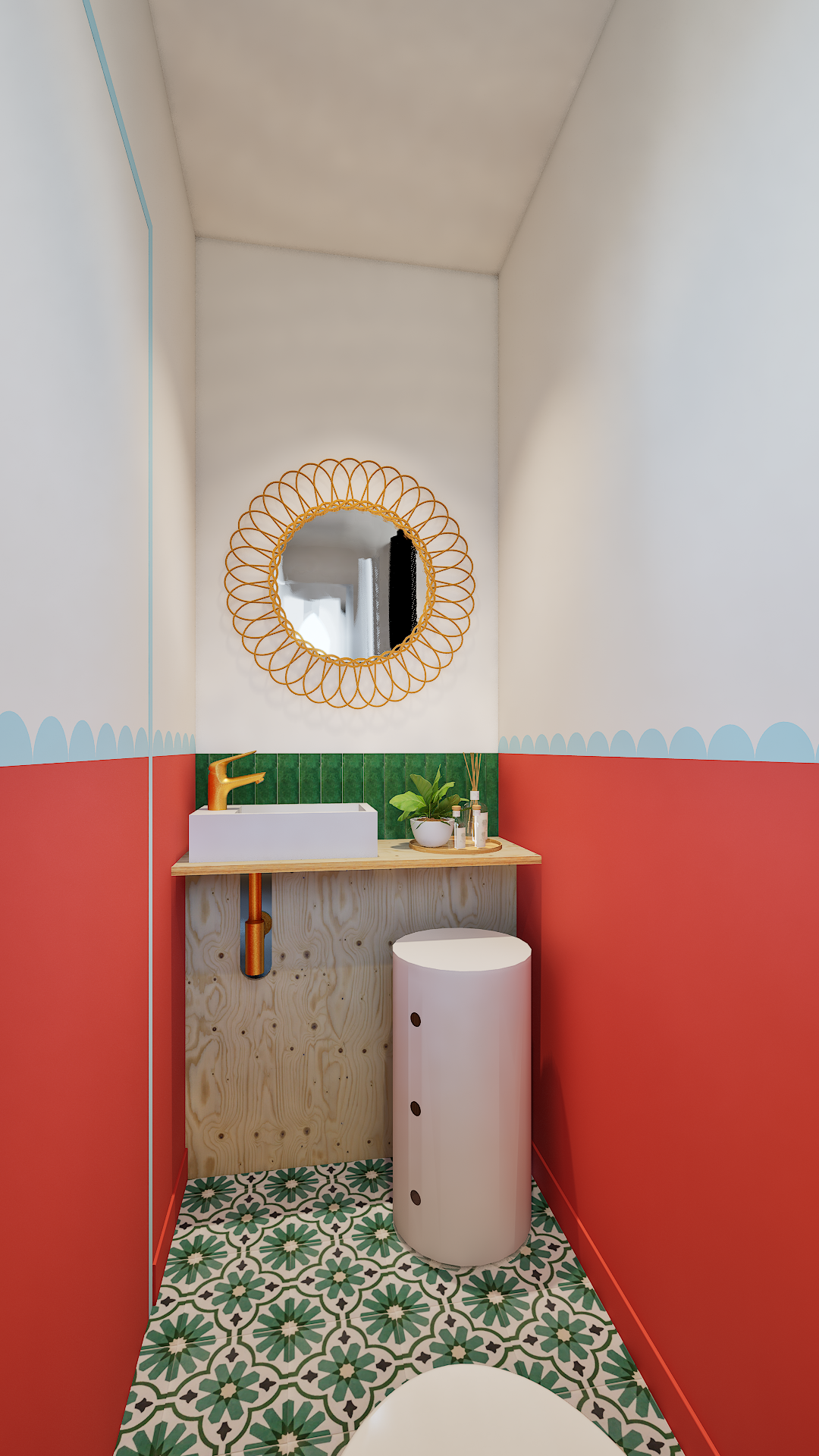 Après une rénovation complète orchestrée par une entreprise générale, ce jeune couple souhaitait aller plus loin en donnant une vraie personnalité à leur maison. L’objectif ? Sortir du blanc immaculé post-travaux pour créer un intérieur audacieux, coloré, et à leur image. Graphiste et illustratrice, ma cliente évolue dans un univers doux, plein de formes, de couleurs et de détails inspirés du design vintage des années 70 à 90. Son mari partage ses envies, et tous deux souhaitaient relever un défi : s’approprier leur maison avec créativité, sans exploser le budget, et réaliser eux-mêmes une bonne partie des transformations.